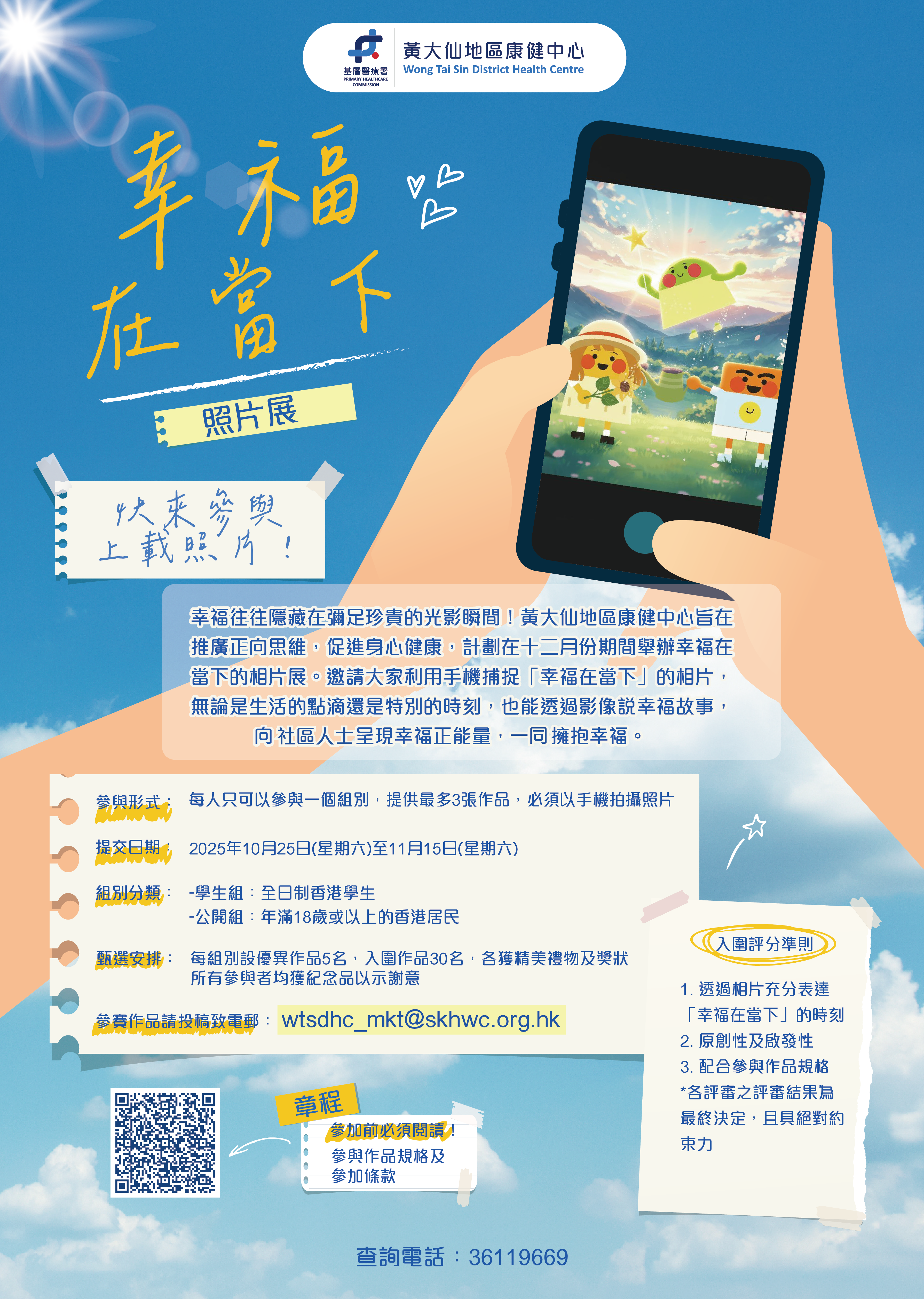 - 只限經電郵遞交,請電郵至wtsdhc_mkt@skhwc.org.hk;電郵主旨請列明:『幸福在當下』_(作品名稱);電郵中請包含以下資料:
