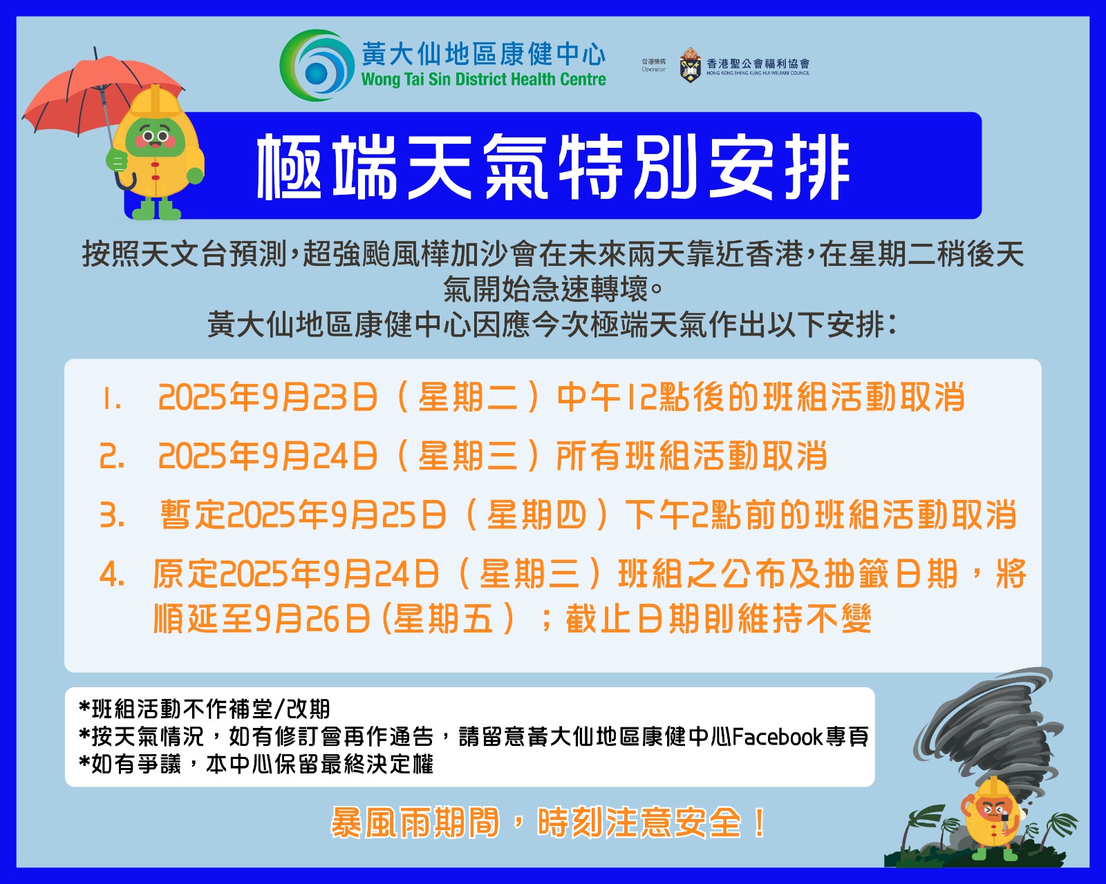 按照天文台預測,超強颱風樺加沙會在未來兩天靠近香港,在星期二稍後天氣開始急速轉壞。黃大仙地區康健中心因應今次極端天氣作出以下安排: