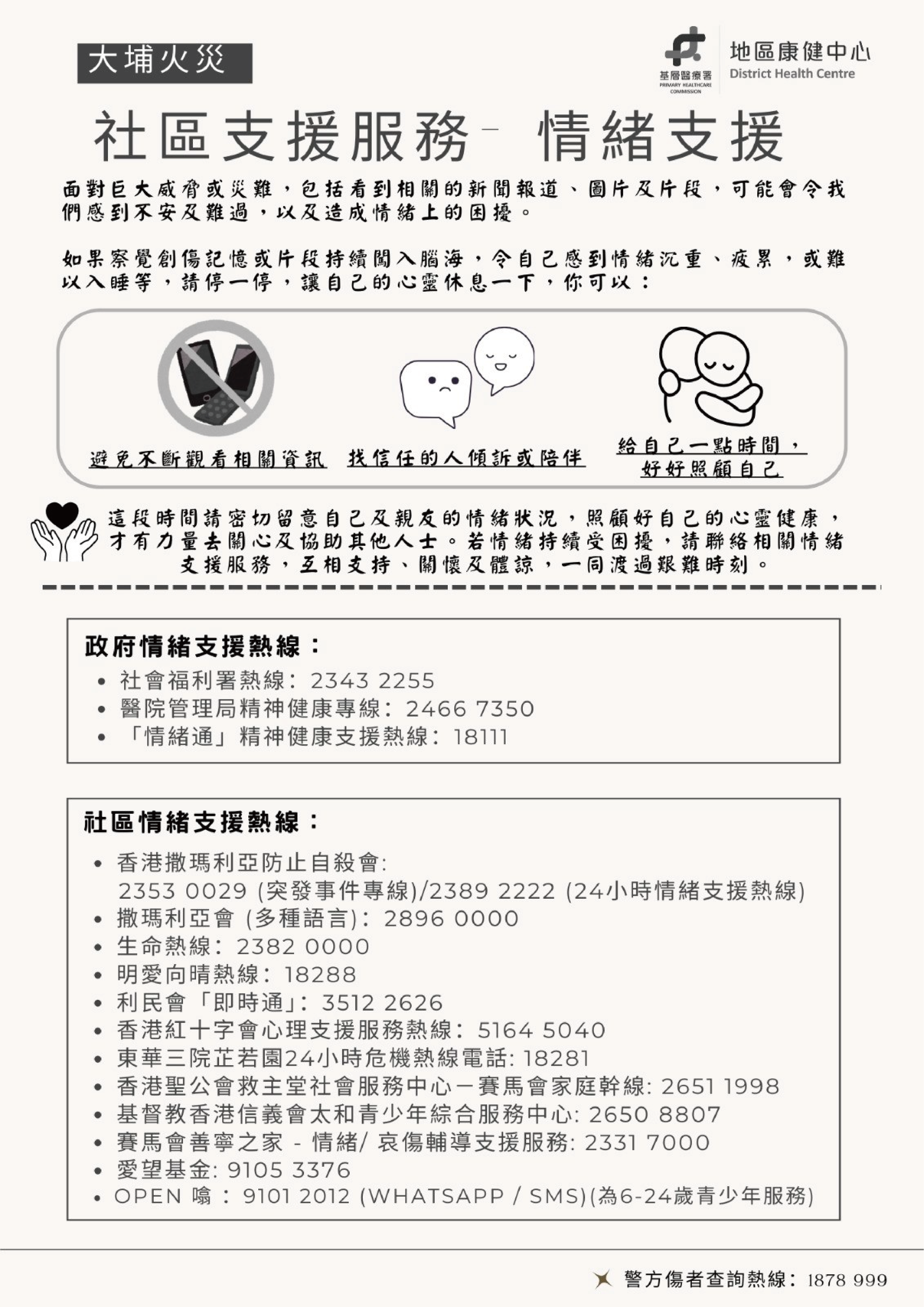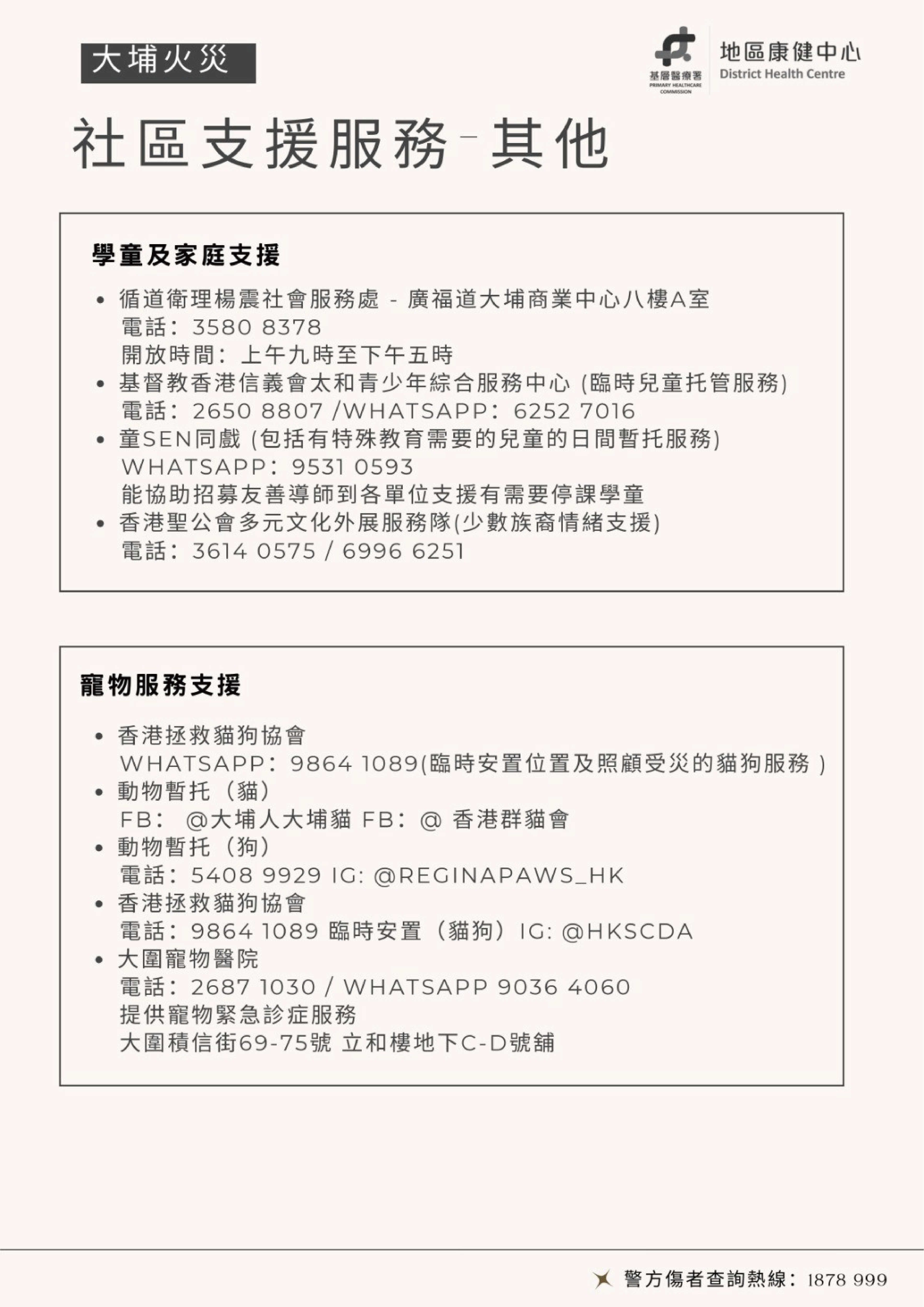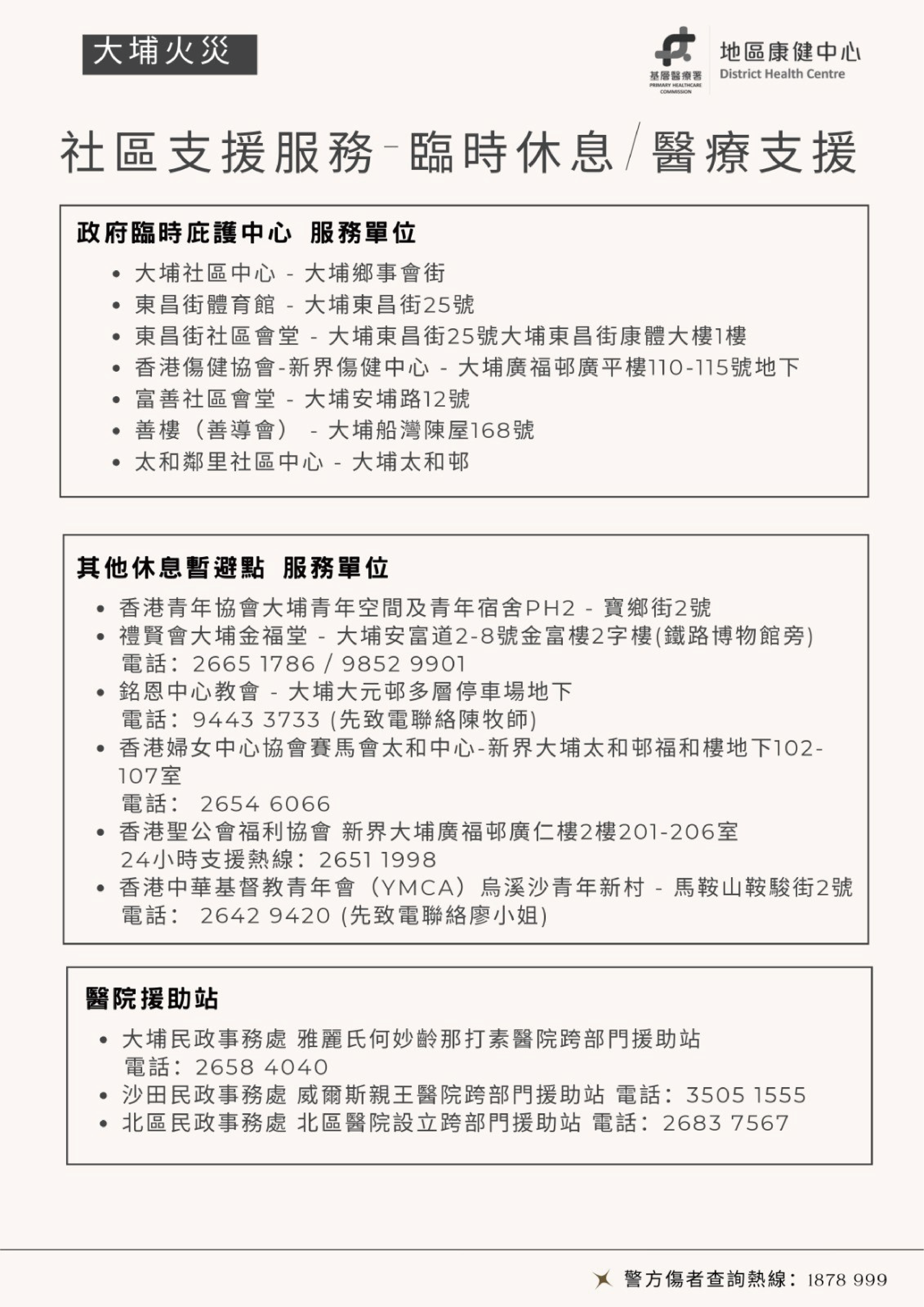 以下是大埔火災相關的社區支援服務一覽,包括臨時休息、醫療支援、情緒支援等服務。